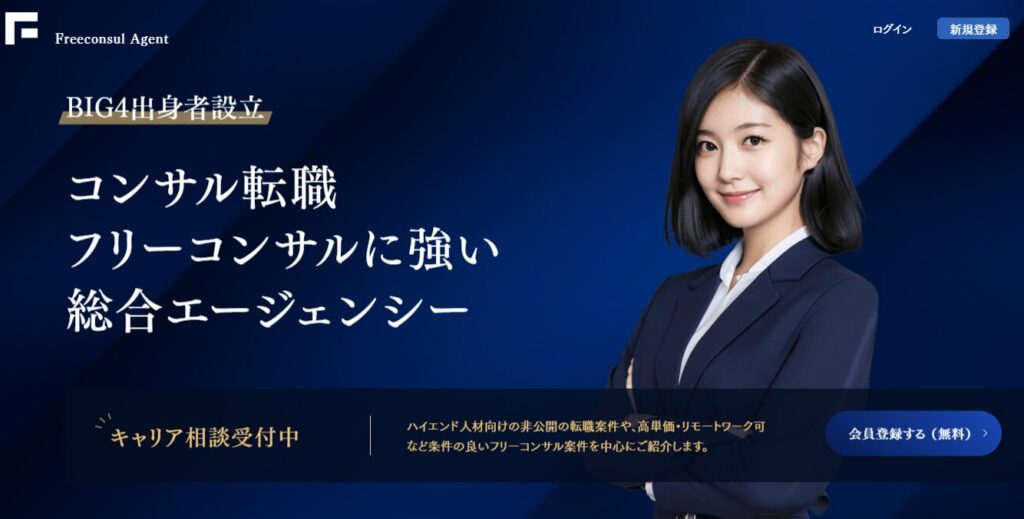フリーコンサル株式会社が運営する「フリーコンサルエージェント」は、コンサル転職およびフリーコンサル領域に強みを持つ案件紹介・転職エージェントです。運営会社であるフリーコンサル株式会社は、ハイクラス人材向けメディア「コンサルGO」を通じて、コンサル業界の転職ノウハウやフリーコンサルのキャリア支援、企業のインタビュー・求人情報などを発信しています。 同メディアを通じて蓄積した求職者のニーズや業界の変化を分析し、その知見をもとに最適なマッチングを実現しています。